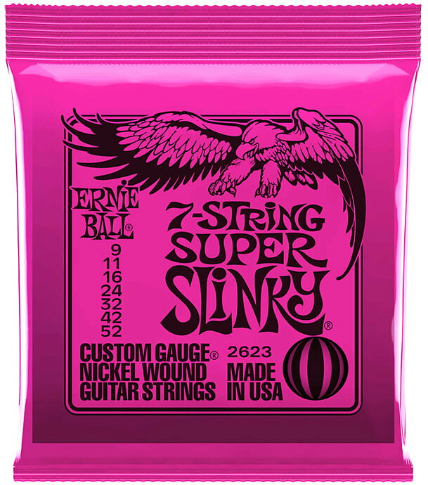 ブランド EnieBall (アーニーボール) 品番 2623 Super Slinky 7Strings 用途 エレキギター弦 ゲージ 009 011 016 024 032 042 052 素材 Nickel Wound ニッケルワウンド