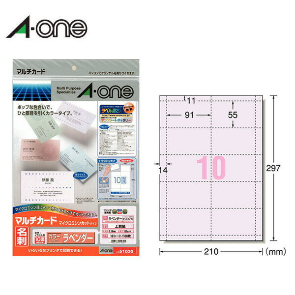 【A4判・マット】エーワン/マルチカード<名刺>(51030) カラータイプ ラベンダー 紫 名刺作成用紙 10面 10シート・100枚 各種プリンタ兼用/A-one