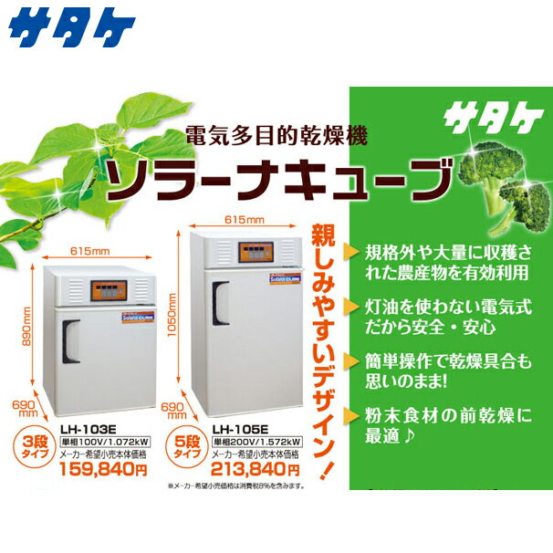 電気式だからCO2排出ゼロ●らくらく!「乾燥温度」「排湿調整」「乾燥時間」の3つを設定するだけの簡単操作・型式:LH-105E・所要動力 定格電圧(V):単相200・定格出力 送風ファン(kW):0.072 ヒータ(kW):1.5(0.75×2)・最大同時出力(kW):1.572・適切乾燥量(kg):15・設定温度(℃):20 - 75・排湿調節:2段階(ON : 90度開 OFF :15度開)・運転時間設定(時間):1 - 90・断熱材:高密度ポリウレタン一体発泡(前後左右40mm、上下50mm)・過熱防止機能:サーモスタット(90℃)・機体質量(kg):60・付属トレイ(PP製)(枚):5・付属品:取扱説明書、レシピ集、保証書・オプション:ステンレストレイ・電源プラグ・コード(コードの長さ約2.6m):接地プラグ3P20A