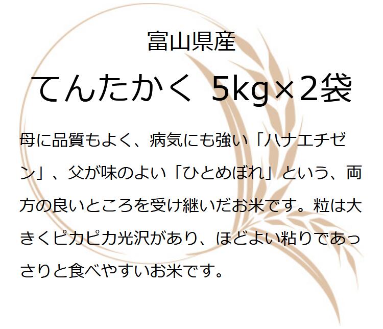 名称:精米 産地:富山県産 品種:てんたかく 産年:2年産 使用割合:10割 内容量:5kg×2袋 精米年月日:別途袋に記載 ▼関連商品▼ てんたかく 【300g 約2合】はこちら てんたかく 【5kg】はこちら てんたかく 【5kg×2袋】はこちら てんたかく 【10kg】はこちら令和2年産 新米 富山県産 てんたかく 5kg×2袋 母に品質もよく、病気にも強い「ハナエチゼン」、父が味のよい「ひとめぼれ」という、両方の良いところを受け継いだお米です。
