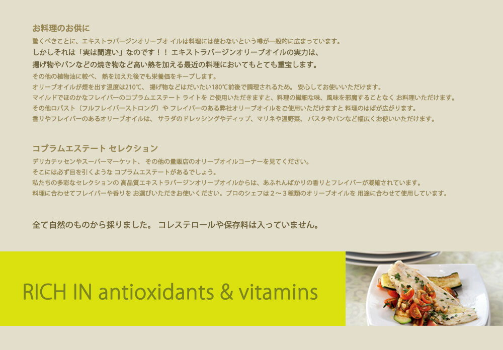 コブラムエステート エキストラバージンオリーブオイル ライト 375mlは、採れたての果実とリンゴの香り、そして微かな甘みが後味を刺激するブレンドです。