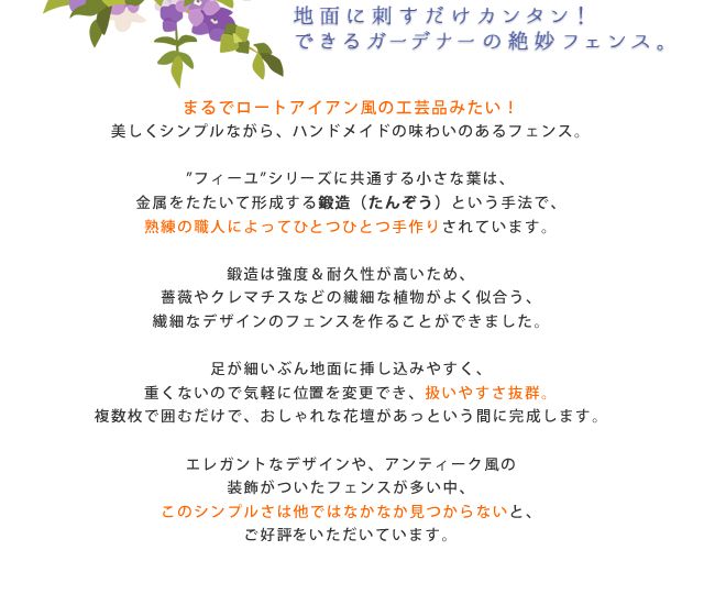 アイアンフェンス「フィーユ」ロータイプ 3枚組 アイアンフェンス幅60cm アイアンフェンス幅60cm×2 アイアンフェンス幅60cm×4 アイアンフェンス幅26cm アイアンフェンス幅26cm×2 アイアンフェン幅26cm×4 アイアンフェンス幅48.5cm アイアンフェンス幅48.5cm×3 ■商品名アイアンフェンス「フィーユ」ロータイプ 3枚組 ■型番 IPN-7201-3P ■カラー ブラック ■サイズ 本体:幅 約485×高さ 約560mm(線径 約5mm)(1枚) ※地中埋め込み部分 約153mm ■重量 約0.8Kg(1枚) ■材質 スチール ■仕上げ 粉体塗装 ■組立区分 完成品 ■生産国 中国 ■備考 基本的に埋め込み部分をしっかり埋め込んで頂ければ自立しますが、柔らかすぎる地面などでは倒れる恐れがありますので、お客様自身で固定いただくか、ご使用をお避けください。