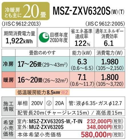 《あす楽》◆15時迄出荷OK!三菱 ルームエアコン【MSZ-ZXV6320S W】2020年 ピュアホワイト 霧ヶ峰 Zシリーズ 単相200V 主に20畳 (旧品番 MSZ-ZXV6319S W)