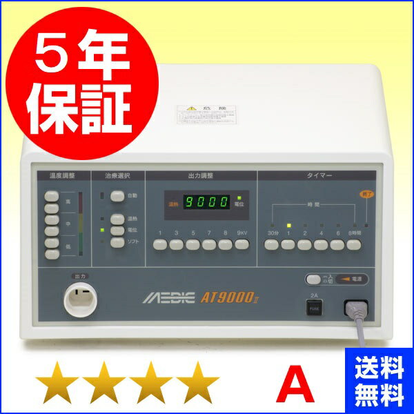 (程度A)5年保証【中古】 メディックATシリーズ「メディックAT9000II」 最大9000ボルト(実効値)の「電位治療」と、冬場にはありがたい「温熱治療」、 電位と温熱が交互に繰り返す「自動治療」、寝るときにオススメの「ソフト治療」といった 多彩な治療が可能です。
