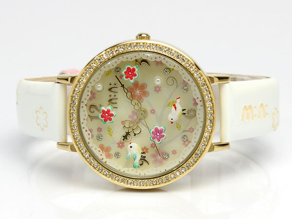 【mini】 ミニ ハンドメイド デコウォッチ 腕時計 レディース キッズ ラインストーン 小鳥 花 レース フラワー ホワイト 本革レザー クラフト 3Dミニチュア MN1065 かわいい Lady's