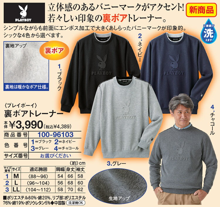 バニーマークがアクセント!若々しい印象の裏ボアトレーナー!立体感のあるバニーマークがアクセント!若々しい印象の裏ボアトレーナー!シンプルながらも前面にエンボス加工で大きくあしらったバニーマークが印象的。