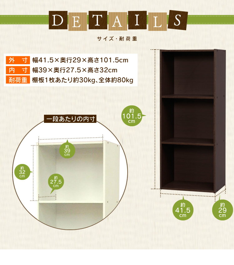 ※お客様組み立て品 ※こちらの商品は、扉・棚板・レールボード等の別売オプション品はございません ◆商品サイズ:幅約41.5×奥行約29×高さ約101.5cm ◆棚内寸:幅約39×奥行約27.6×高さ32cm ◆耐荷重:全体80kg、棚板1枚あたり30kg ◆主要材質:棚・プリント紙化粧パーティクルボード 、背板・MDF ◆固定棚板:2枚FAQよくある質問は>>こちらをご確認下さい<<