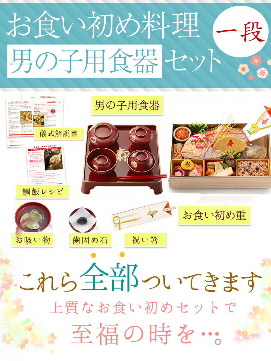 名称 そうざい(お食い初め一段(男児用器セット) 付属品 祝い膳(1膳)、ヒレ飾り(1セット)、尾紙(1セット)、歯固めの石(1セット) 内容量 2人前 賞味期限 商品に記載 保存方法 -18℃以下で保存して下さい。